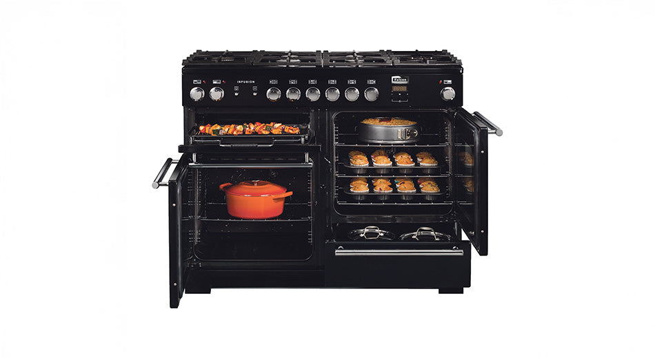 De Falcon Infusion is beschikbaar als 90cm of 110cm breed model. In het geval van een 110cm model krijg je er een extra opberglade bij en in het geval van gaspitten een extra pit. Daarnaast kun je kiezen uit 5 chique kleuren waaronder de populaire Charcoal Black en Mineral Green. What's your choise...