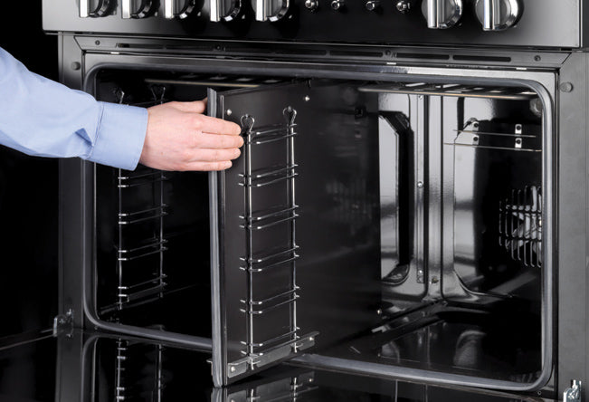 De Falcon Professional Plus FX wordt standaard geleverd met het 'ESP' paneel. Dit paneel kan in het midden van de oven worden geschoven waardoor je de ovenruimte verkleint van 114 liter naar 49 liter. Dit zorgt ervoor dat je geen onnidige energie verspilt als je de grote oven ruimte niet nodig hebt. Uiteraard wordt het fornuis standaard geleverd met accessoires geschikt voor de grote oven en ook voor als het ESP paneel gebruikt word.