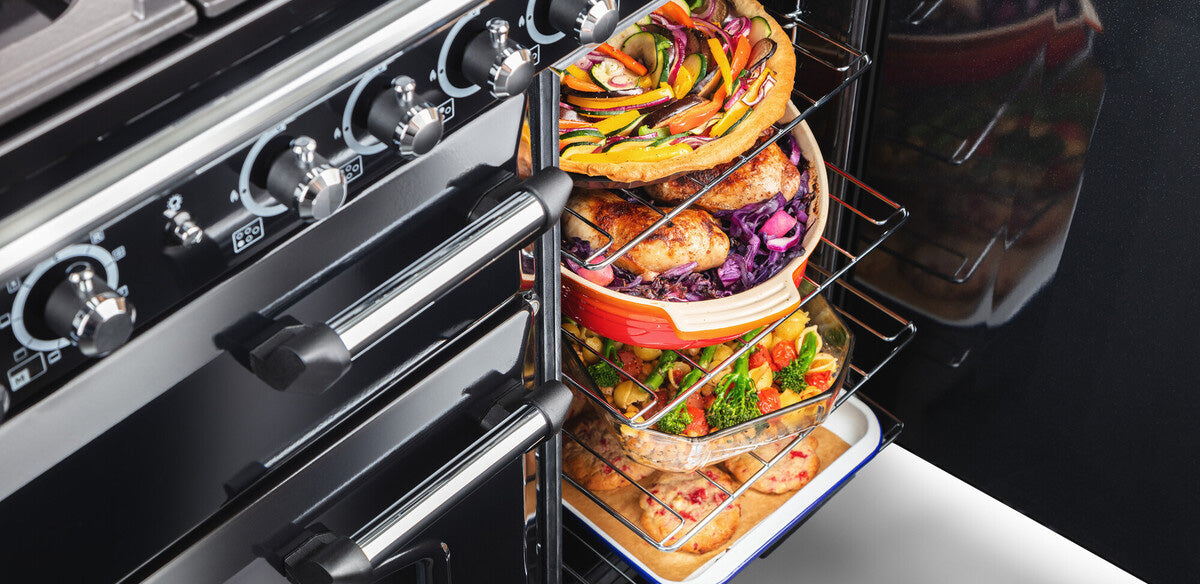De rechteroven is een volwaardige hetelucht oven en is ideaal om een tweede gerecht op een andere temperatuur in te bereiden. De lade links onder is ideaal om ovenroosters in op te bergen die je niet gebruikt. Omdat dit een 110 cm breed model is heeft het naast 5 krachtige gaspitten (waaronder een dubbel-rings wokbrander) een multizones plaat.